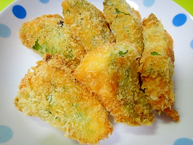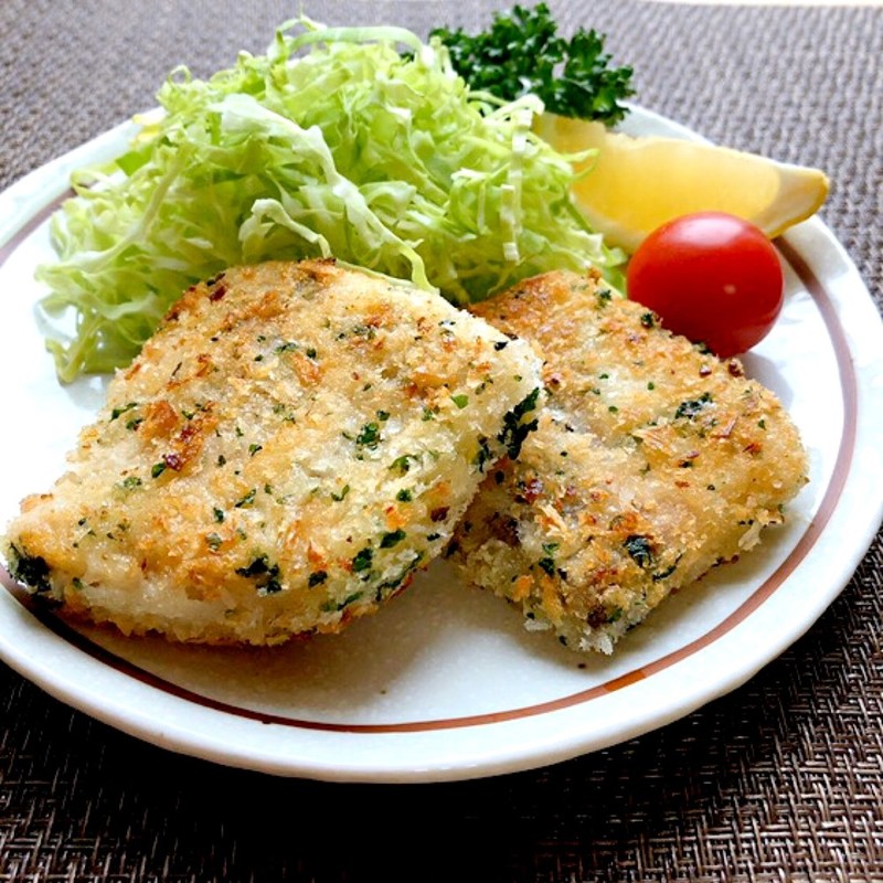 Web作り方 かじきは縦3等分に切って塩、こしょう各少々をふり、ころもの材料を小麦粉、溶き卵、パン粉の順につける。 揚げ油を 中温 (約170℃)に熱し、1を入れて全体がこんがりと色づくWebメカジキの両面に塩こしょうをふる。 薄力粉をまぶし溶き卵にくぐらせパン粉をつける。 2 フライパンにオリーブオイルを入れて熱し、1を入れて焼き色がつくまで中火で焼く。 裏返して大葉香る「カジキの香りフライ」 衣に大葉の香りをプラスして、さっぱりとした味に仕上げます。 管理栄養士など食の専門家によるレシピです。 美味し